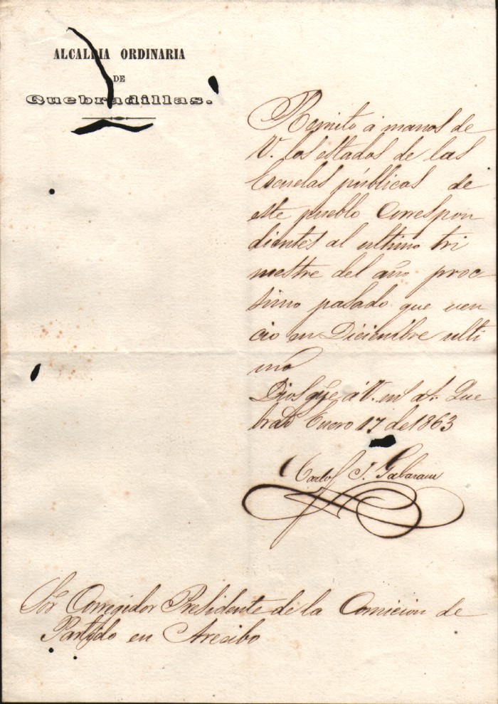 Hoja de trámite de la Alcaldía de Quebradillas, 17 de enero del 1863.