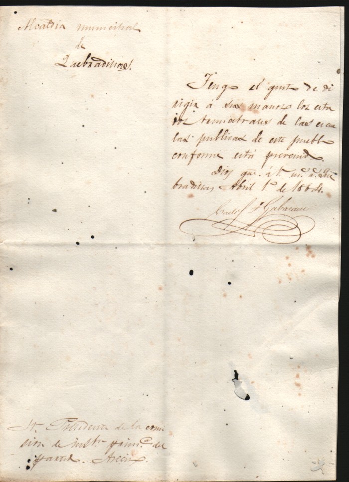 Hoja de trámite de la Alcaldía de Quebradillas, 1ero de abril del 1864.