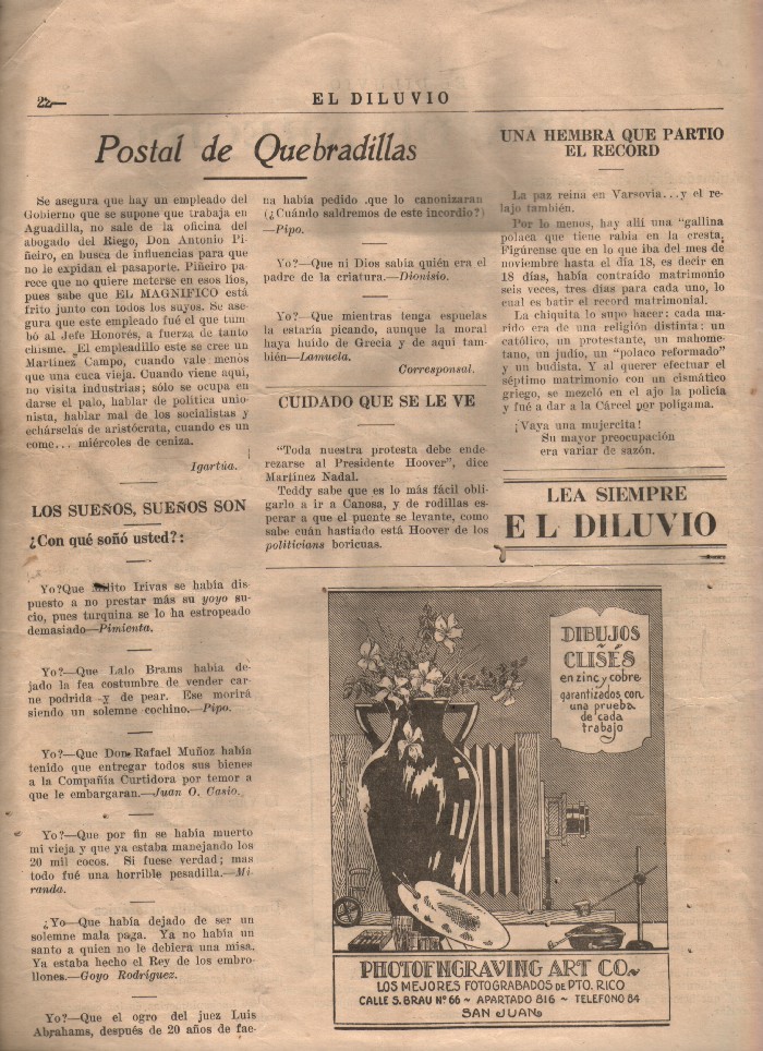 Revista El Diluvio, 7 de febrero del 1931, página con comentarios de Quebradillas.
