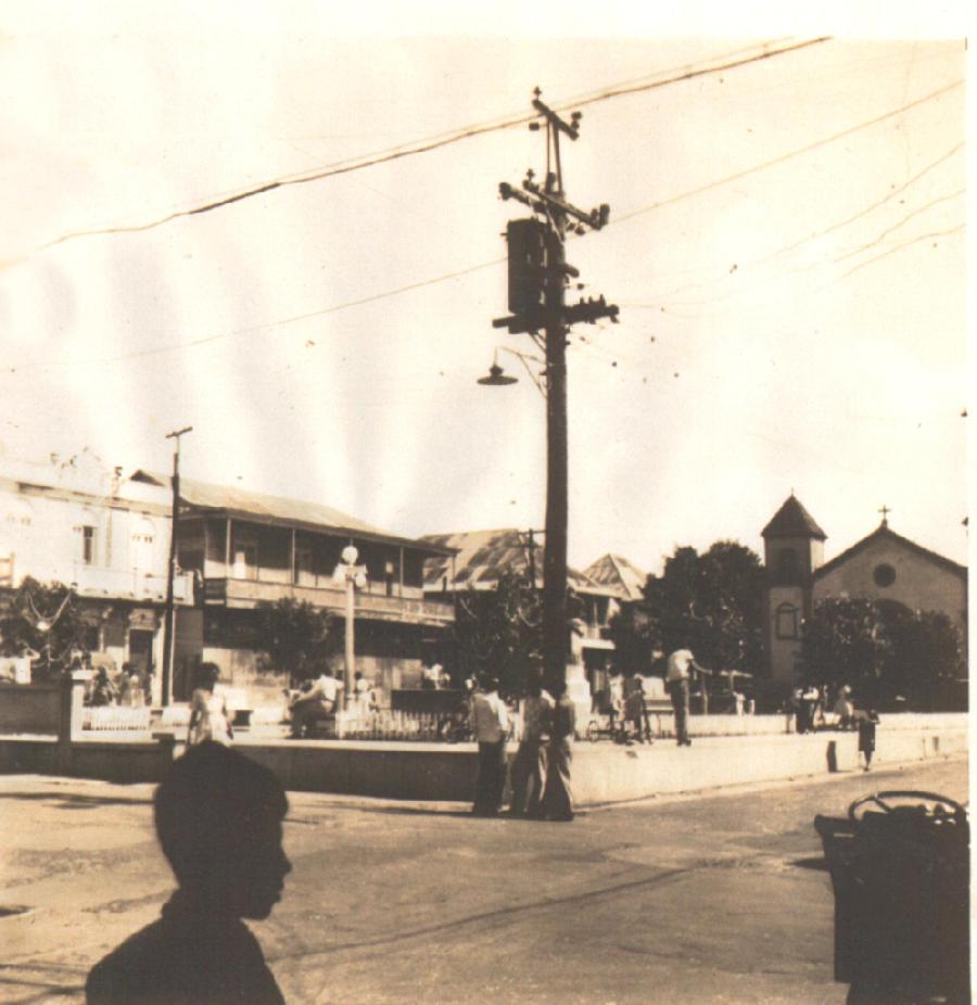 Una de las antiguas plazas de nuestro pueblo. Nota la Antigua Iglesia Católica al lado derecho y las viejas casonas que rodeaban la plaza de recreo. ¿Quien será el niño en la silueta?