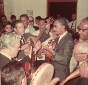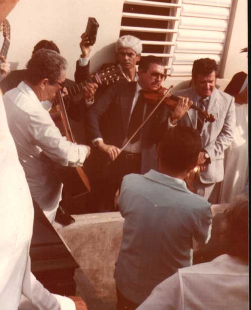 Entierro de Don Moncho Chaves, antes de salir de su casa. Vemos entre otros a Rubén (Baby) Luciano (guitarra), Hiram Gómez (con la grabadora), Rafael Castillo (violín) y Monzo (Monserrate